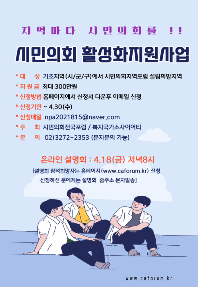 시민의회전국포럼을 기초지자체를 중심으로 시민의회지역포럼을 설립할 의지가 있는 지역에 최대 3백만원의 설립지원금을 지원하는 시민의회 활성화 지원사업을 시민기금으로 추진한다. 설립지역에서는 최소 3인 이상의 제안자가 있어야 하며해당 지역에서 1년 이내에 시민의회지역포럼 창립계획을 가지고 있어야 한다자세한 공고문과 신청서는 홈페이지에 있으며, 4월 말까지 신청을 받아 선정지역을 발표할 예정이다.
