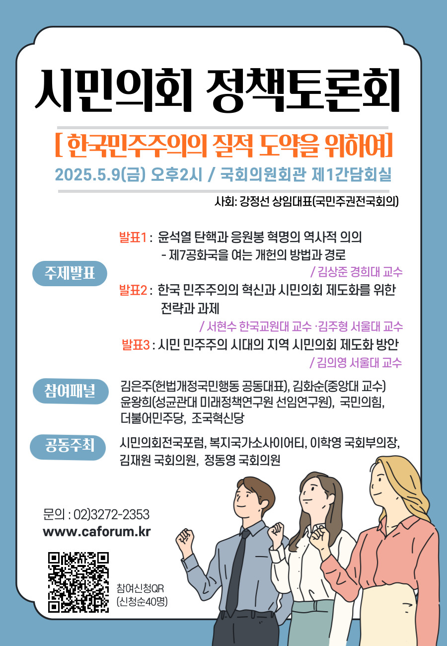 또한 시민의회 정책토론회가 5월 9(오후2시부터 국회의원회관 제1간담회실에서 열린다한국 민주주의의 질적 도약을 위하여라는 주제로 열리는 이번 정책토론회에서는 ▲ 윤석열 탄핵과 응원봉 혁명의 역사적 의의7공화국을 여는 개헌의 방법과 경로 (김상준 경희대 교수▲ 한국 민주주의의 혁신과 시민의회 제도화를 위한 전략과 과제 (서현수 한국교원대 교수 ·김주형 서울대 교수▲ 시민 민주주의 시대의 지역 시민의회 제도화 방안 (김의영 서울대 교수등 시민의회를 중심으로 주제발표를 한다. 토론패널로는 김은주(헌법개정국민행동 공동대표), 김화순(중앙대 교수), 윤왕희(성균관대 미래정책연구원 선임연구원)등의 전문가들과 국민의힘더불어민주당조국혁신당 등 주요정당 관계자들이 참여해 한국사회에서 시민의회 도입 및 시민주권 확보를 어떻게 만들어 갈 것인지를 논의할 예정이다.